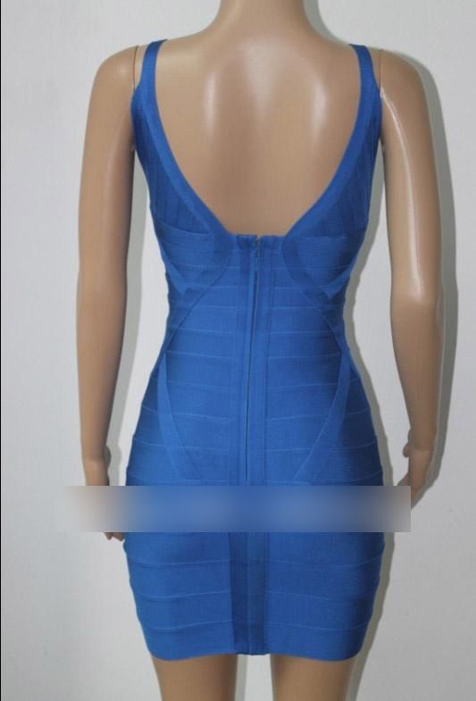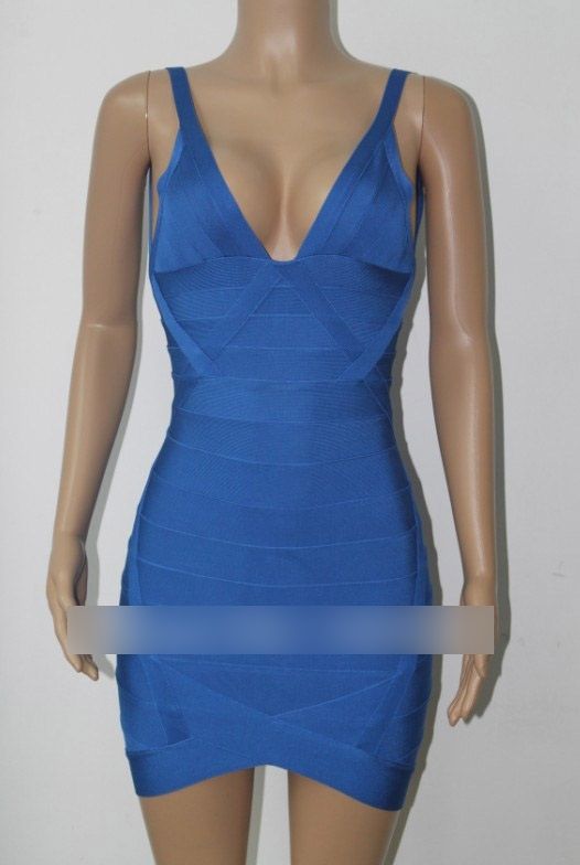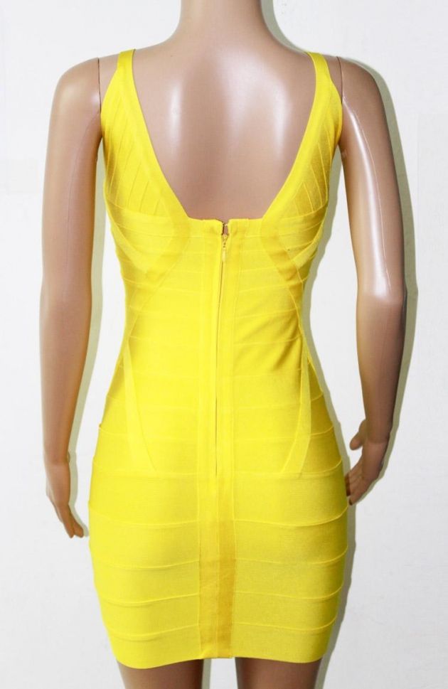 Къса рокля Herve Leger 2015 с дълбока V-образно деколте, жълта и синя