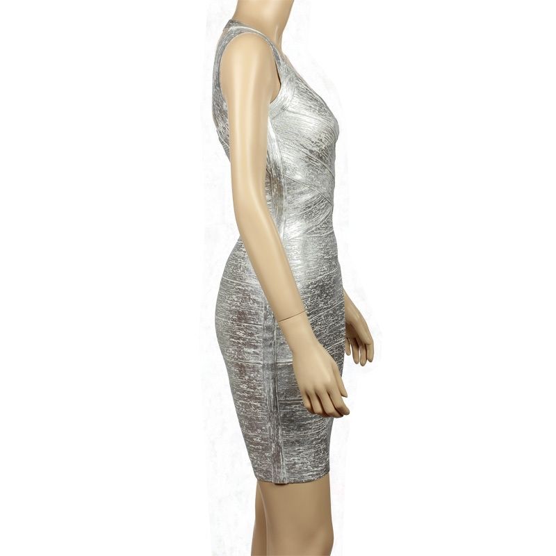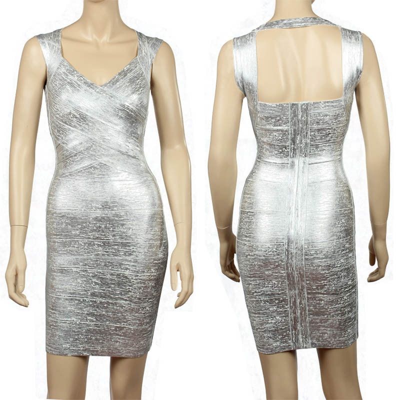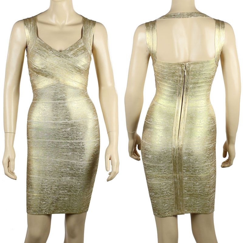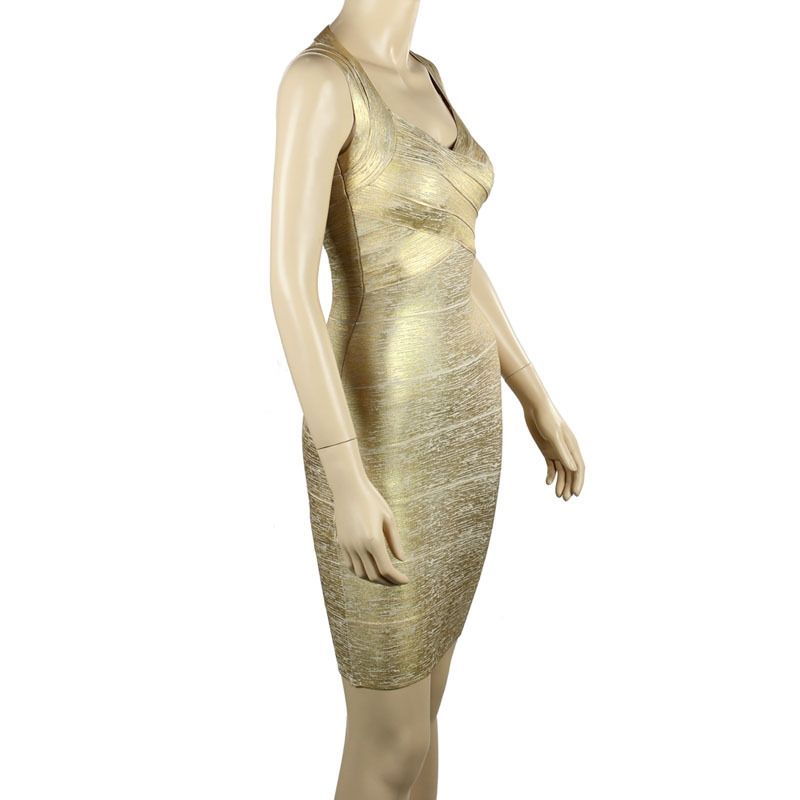 Елегантна ластична рокля Herve Leger златист и сребрист металик