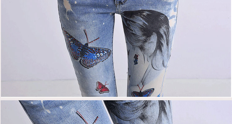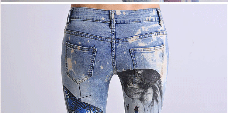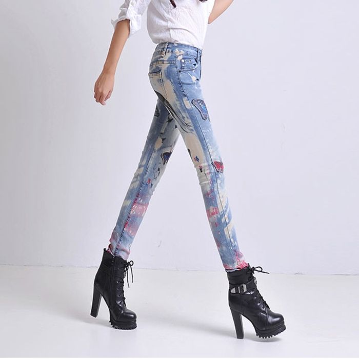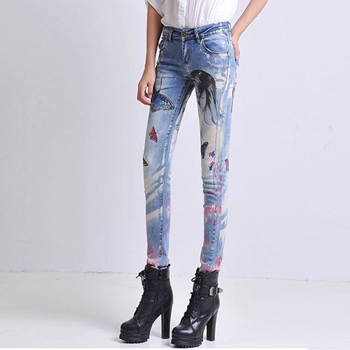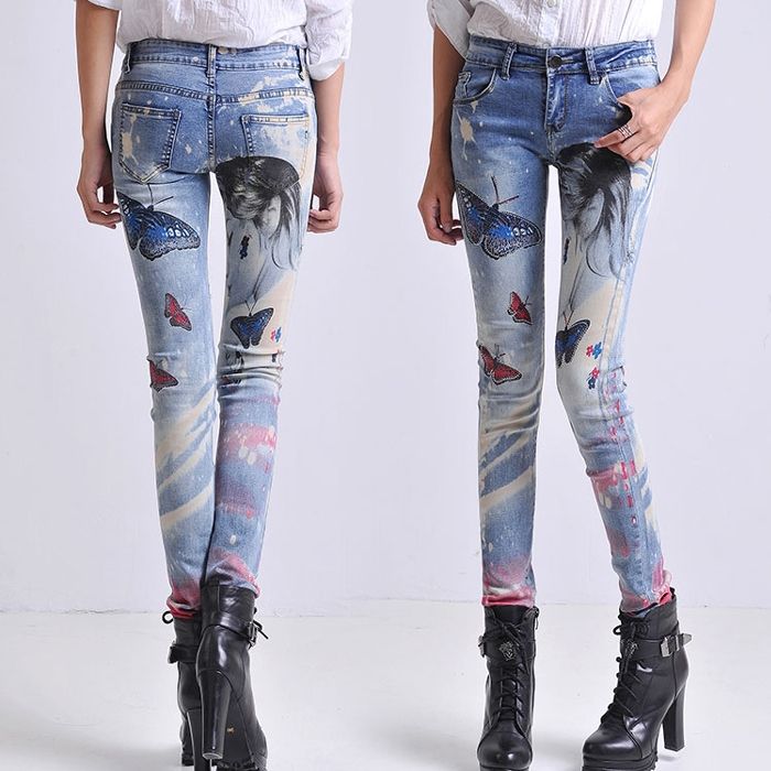 Цветни слим дънки с пеперуди и принт
