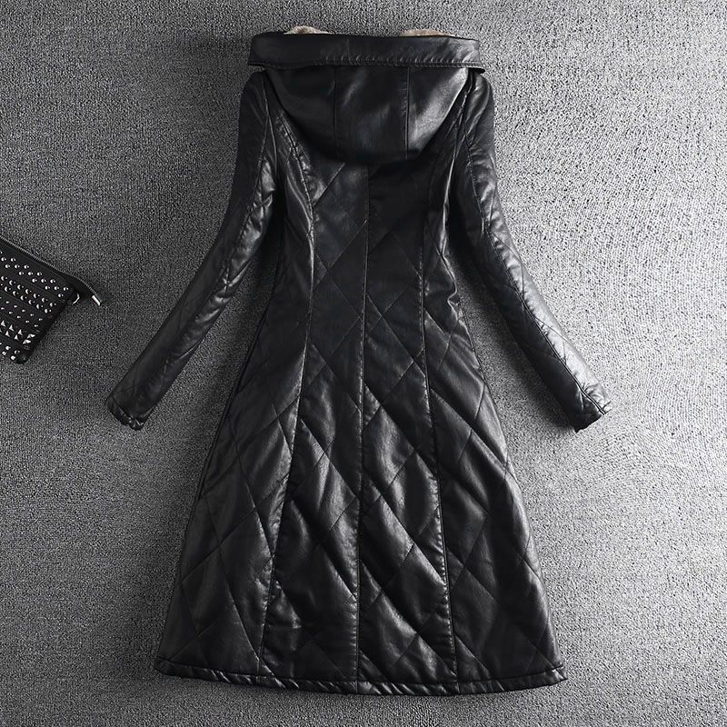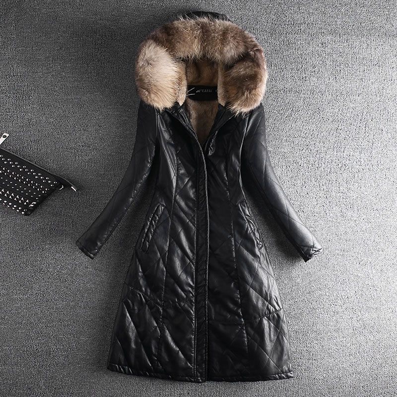 Дамско дълго кожено яке с качулка и яка естествен косъм миеща мечка, НАЛИЧНИ размери M, L, XL