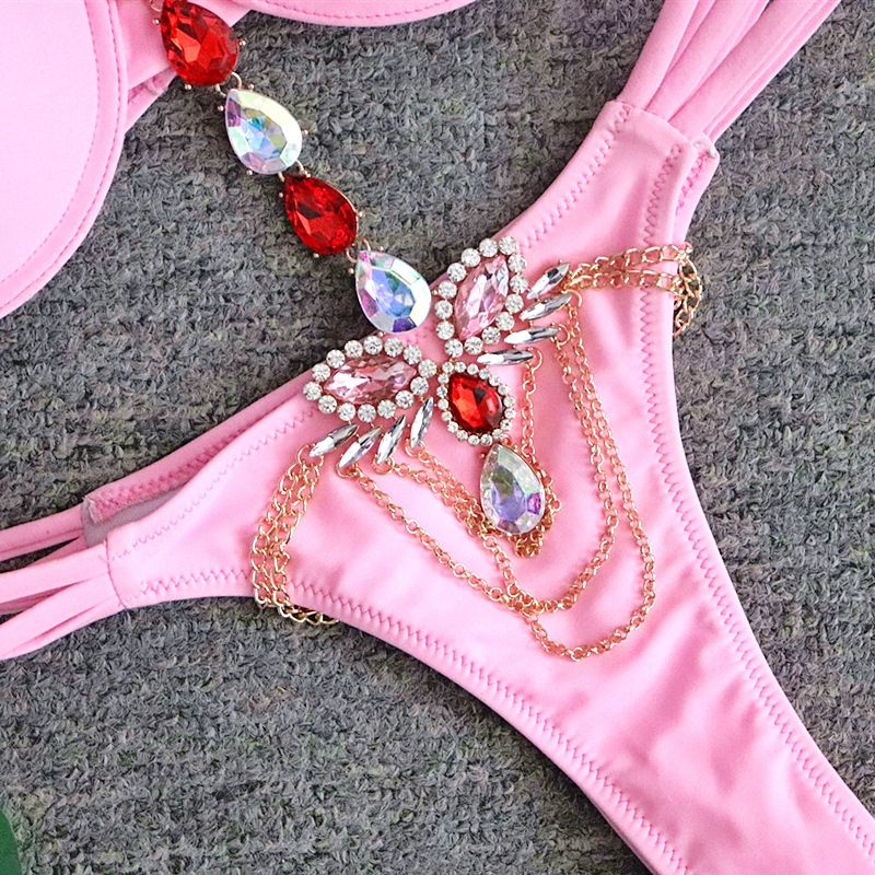 Луксозен розов бански от две части с колие с кристални камъни