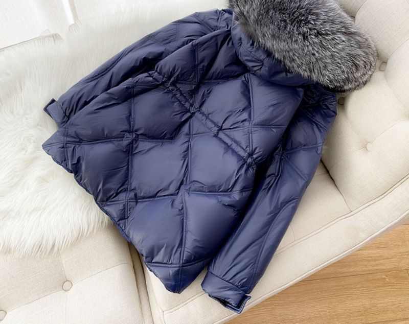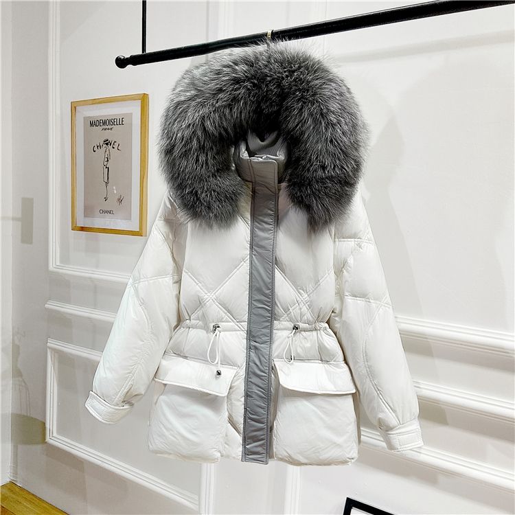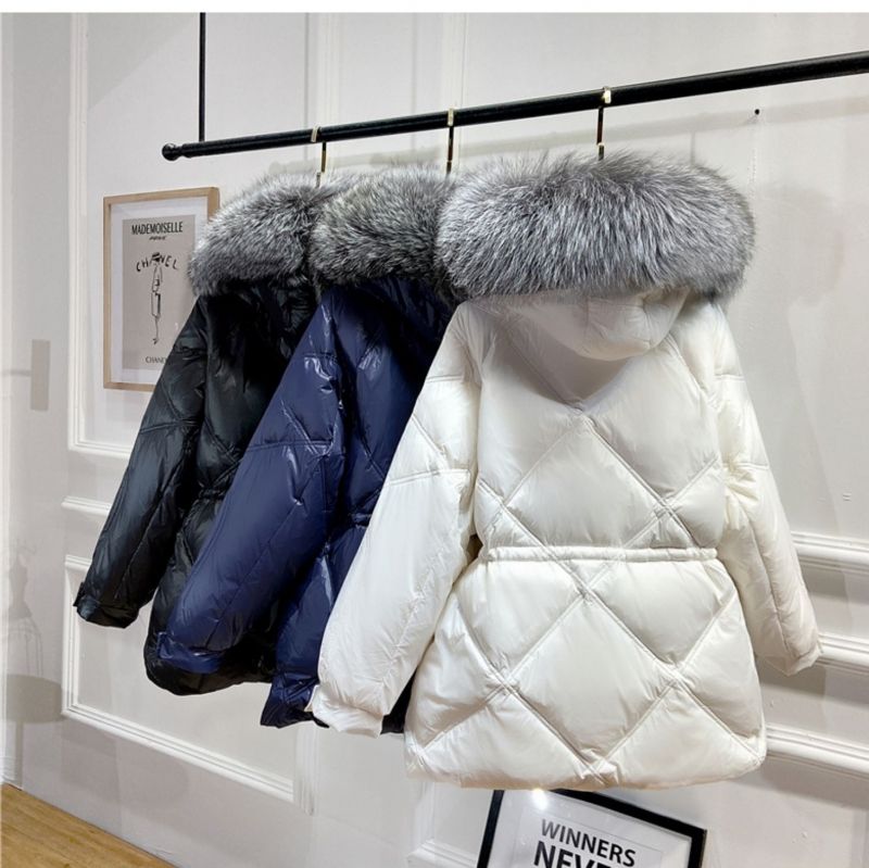 Дамско яке с гъши пух и качулка с голяма яка естествен косъм сребърна лисица