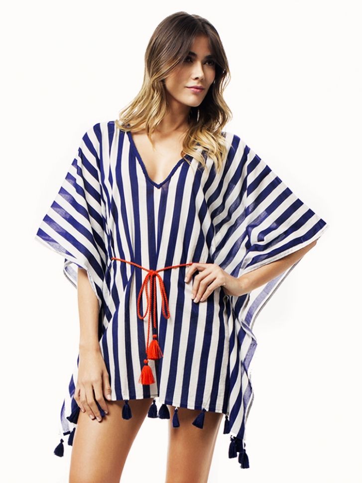 Модна дамска свободна плажна туника бяло и синьо райе с пискюли, НАЛИЧНА